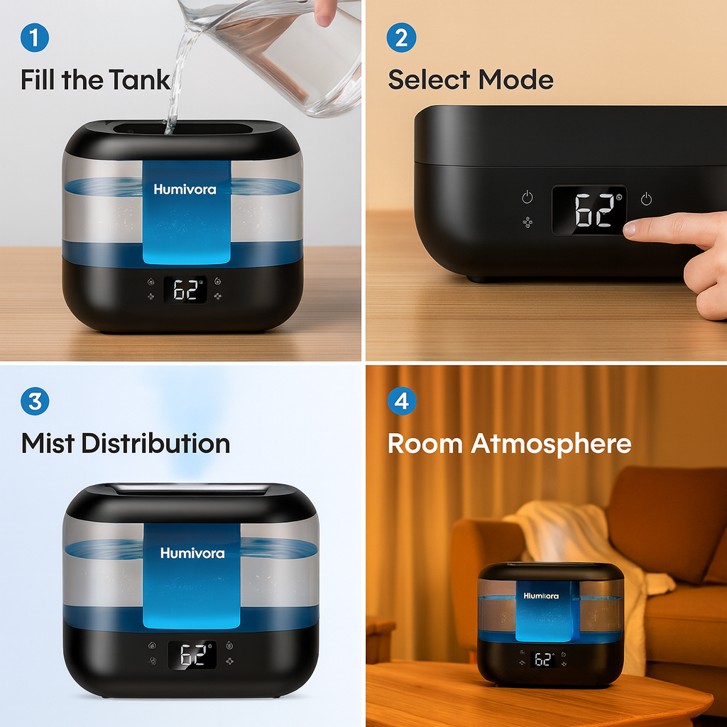 Humivora is made for everyday use. Simply fill the tank with water, select the preferred mode, and let the device balance the humidity. With the clear display and touch controls, every step feels simple and natural.